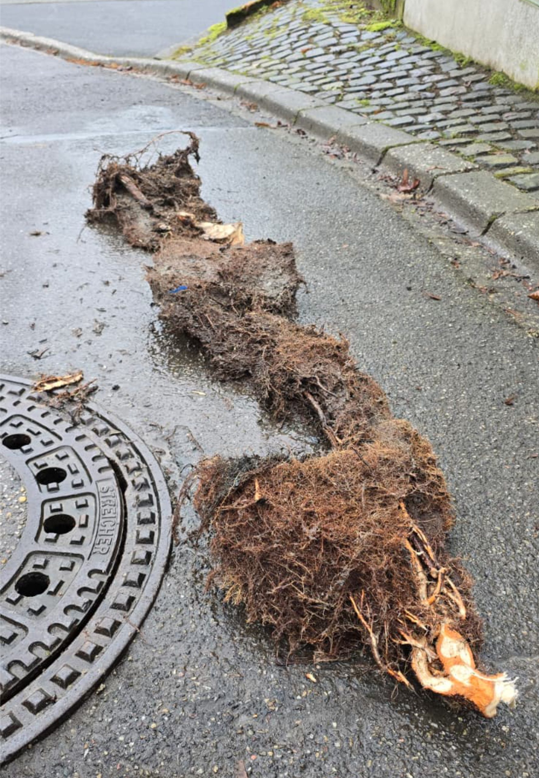 Wurzeln dringen bevorzugt an Rohrstellen ein, an denen der Widerstand am geringsten ist – wie Risse, Undichtheiten, Muffenversätze oder nicht fachgerecht angeschlossene Zuläufe. Schon kleinste Öffnungen genügen, damit sie ins Rohrsystem eindringen und sich weiter ausbreiten können. Mit zunehmendem Wachstum vergrößern sich die Schadstellen, Rohrverbindungen werden destabilisiert und es kommt zu Querschnittsverengungen, welche die hydraulische Leistungsfähigkeit des Kanals verringern. Ablagerungen an den Wurzelstrukturen reduzieren den Abfluss zusätzlich und erhöhen die Gefahr von Rückstau. Fortschreitende Undichtheiten können Exfiltrationen ins Erdreich oder Infiltrationen von Fremdwasser verursachen, was die Belastung nachgeschalteter Anlagen erhöht. Unbehandelter Wurzeleinwuchs beschleunigt die Schadensdynamik im Entwässerungssystem erheblich.